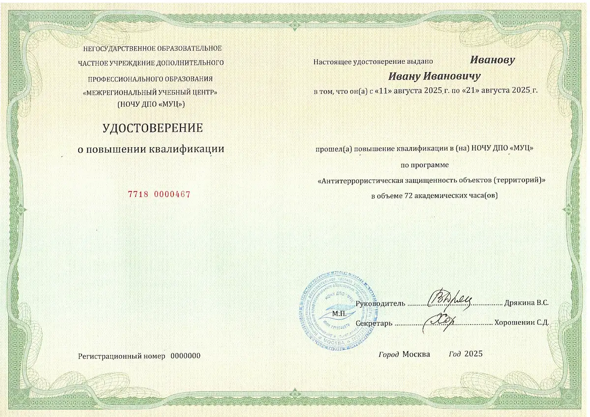 «Межрегиональный учебный центр» приглашает пройти дистанционное обучение антитеррористической защищенности по программе дополнительного профессионального образования. Наши курсы антитеррористической защищенности позволяют специалистам, руководителям и сотрудникам служб безопасности получить актуальные знания и навыки в области обеспечения безопасности и предотвращения террористических угроз. Программа разработана в соответствии с требованиями государственных нормативов, что гарантирует ее практическую ценность и соответствие современным условиям.