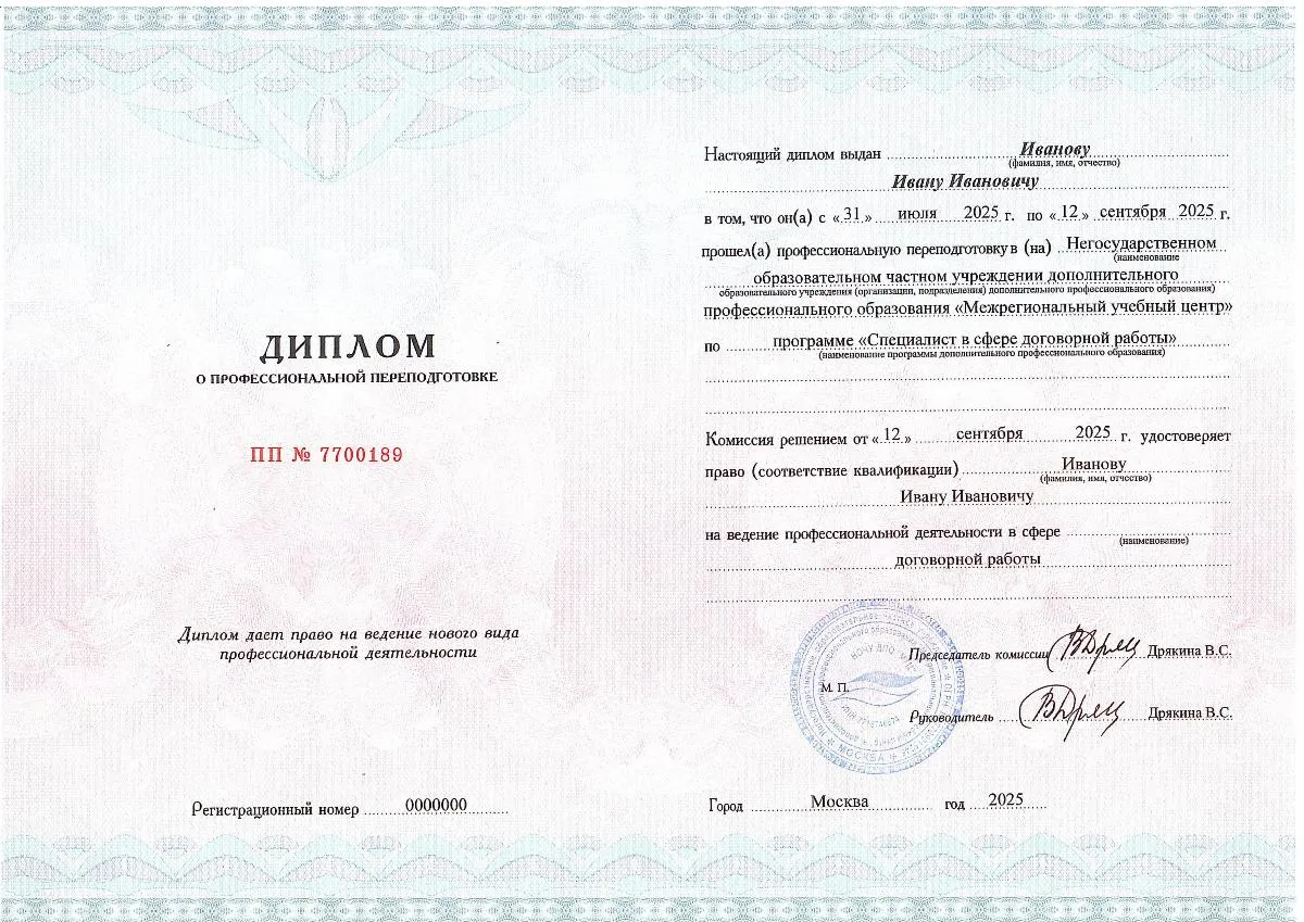 «Межрегиональный учебный центр» — это надежный образовательный партнер, предлагающий переподготовку по договорной работе с упором на практику. Наши программы разрабатываются с учетом требований законодательства и актуальных изменений в отрасли. Преподаватели — практикующие эксперты, которые делятся не только теоретическими знаниями, но и рабочими инструментами, проверенными в реальных условиях.