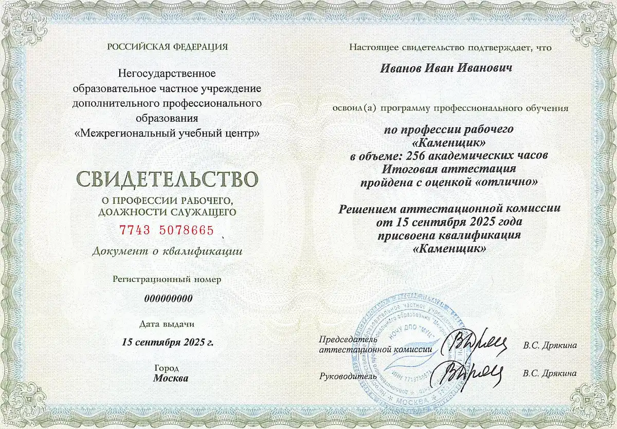 Выбирая курсы каменщиков в Москве в НОЧУ ДПО «Межрегиональный учебный центр», вы получаете: