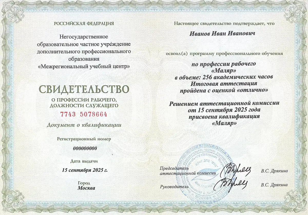 После успешного завершения обучения и защиты аттестационной работы выдается свидетельство, подтверждающее присвоение профессии и квалификации «Маляр».