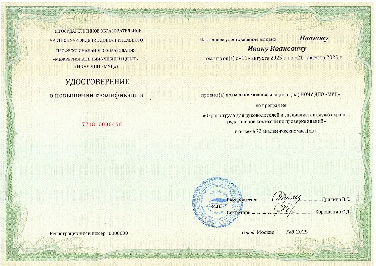 «Межрегиональный учебный центр» (НОЧУ ДПО «МУЦ») предлагает пройти дистанционное обучение по программе повышения квалификации по охране труда продолжительностью 72 часа. Курс предназначен для руководителей, специалистов служб охраны труда, а также членов комиссий по проверке знаний требований охраны труда.