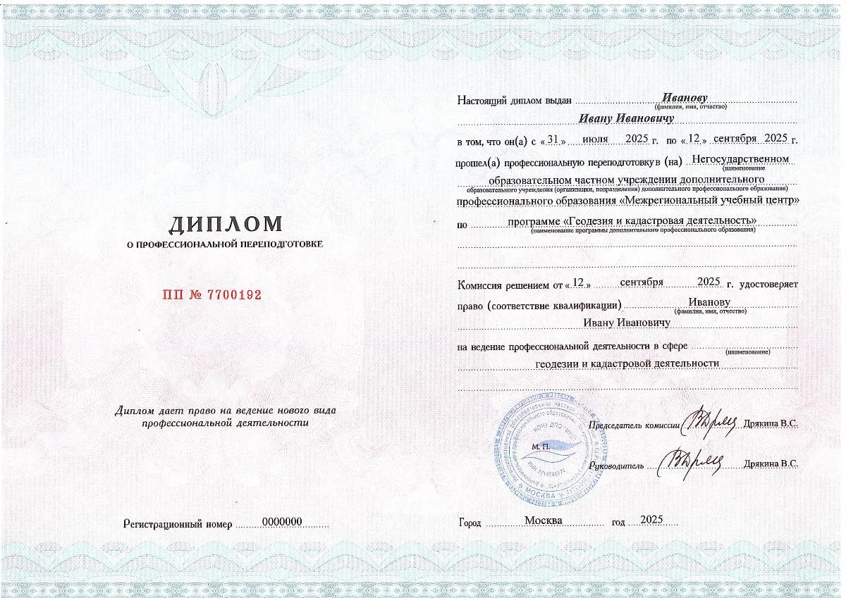 Выбирая наш центр, вы получаете качественное образование, диплом установленного образца о профессиональной переподготовке кадастровых инженеров, который позволит официально работать в этой сфере и вступить в СРО кадастровых инженеров.