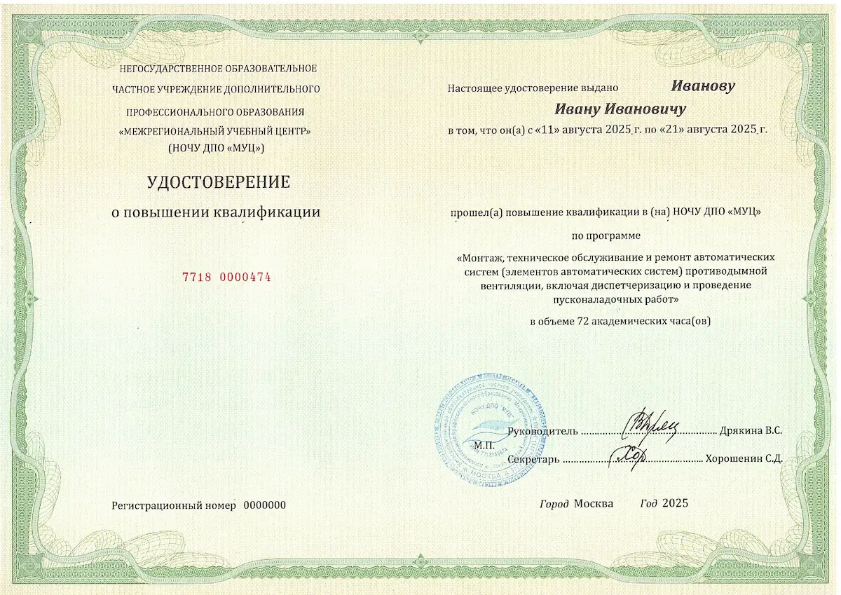 Итогом станет официальное удостоверение о дополнительном профессиональном образовании, подтверждающее успешное прохождение обучения монтажу вентиляции и готовность к выполнению профильных задач на высоком уровне.