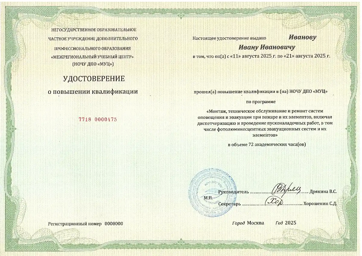 Выпускники курса получают удостоверение установленного образца о дополнительном профессиональном образовании. Этот документ подтверждает, что они прошли обучение фотолюминесцентным системам и эвакуации и готовы выполнять монтаж, ремонт и наладку систем на профессиональном уровне. Регулярное повышение квалификации эвакуации является обязательным условием для работников организаций, которые хотят соответствовать требованиям лицензирования МЧС.
