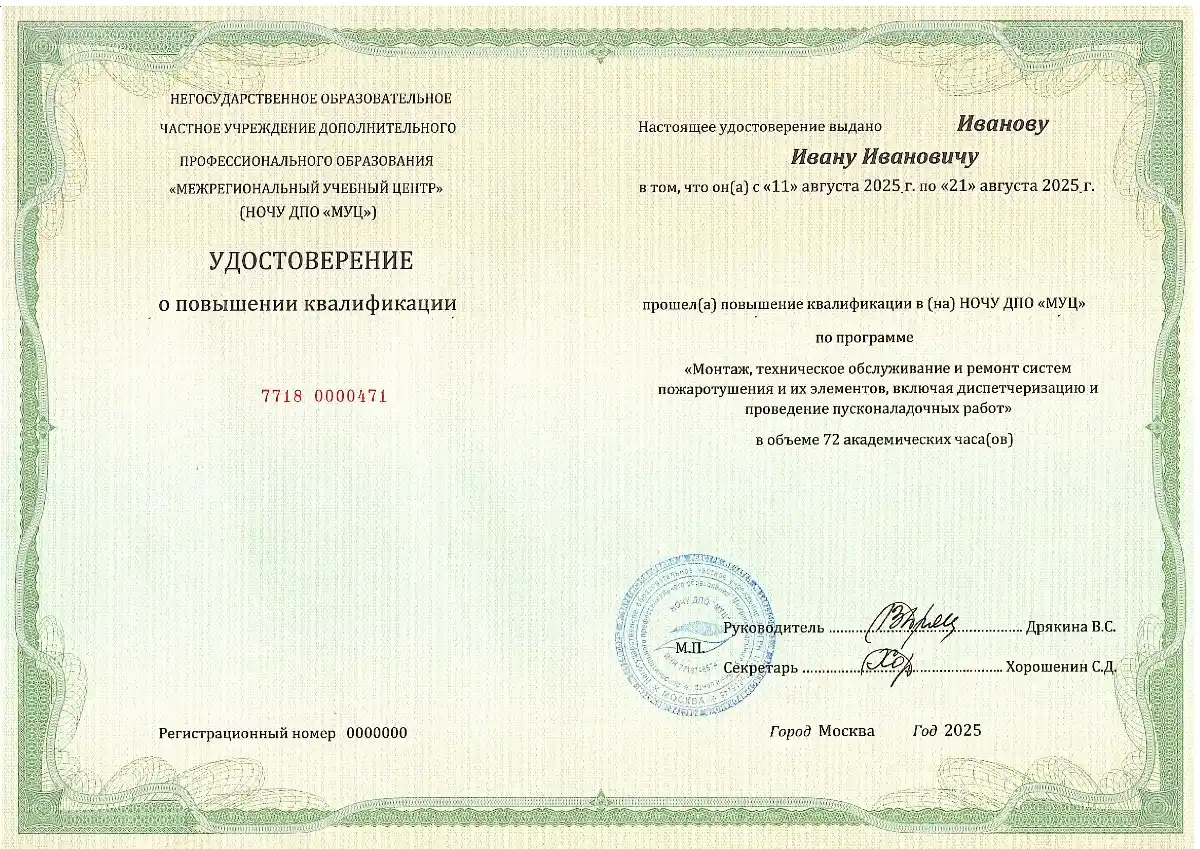 «Межрегиональный учебный центр» приглашает пройти дополнительную профессиональную программу обучения пожаротушению по направлению «Монтаж, техническое обслуживание и ремонт систем пожаротушения и их элементов, включая диспетчеризацию и проведение пусконаладочных работ». Курс разработан специально для специалистов, которым необходимо подтвердить квалификацию и выполнить требования для получения лицензии МЧС.
