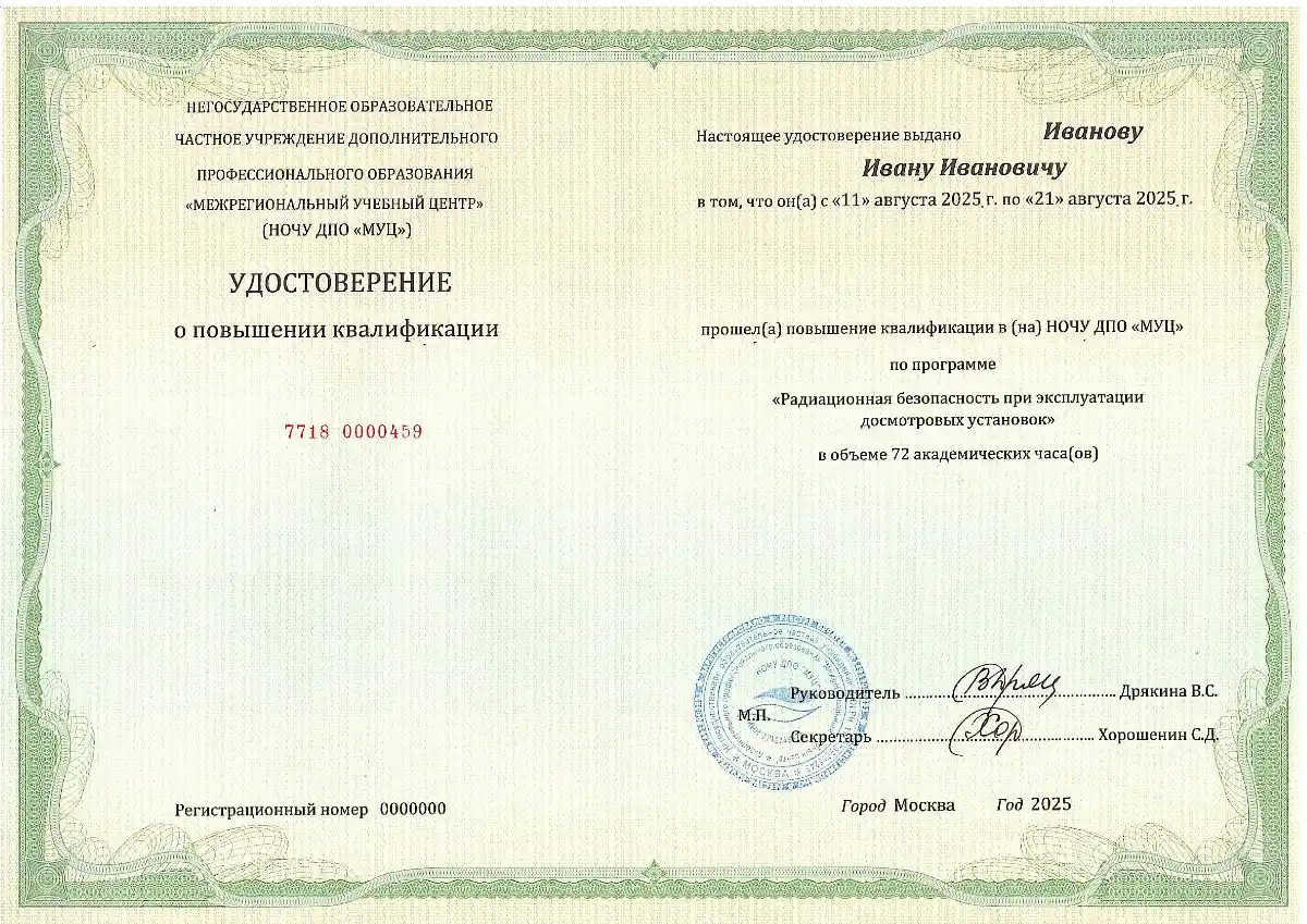 «Межрегиональный учебный центр» приглашает пройти программу по радиационной безопасности на досмотровых установках в формате дистанционного обучения. Курс рассчитан на 72 академических часа и завершается выдачей удостоверения государственного образца о повышении квалификации.