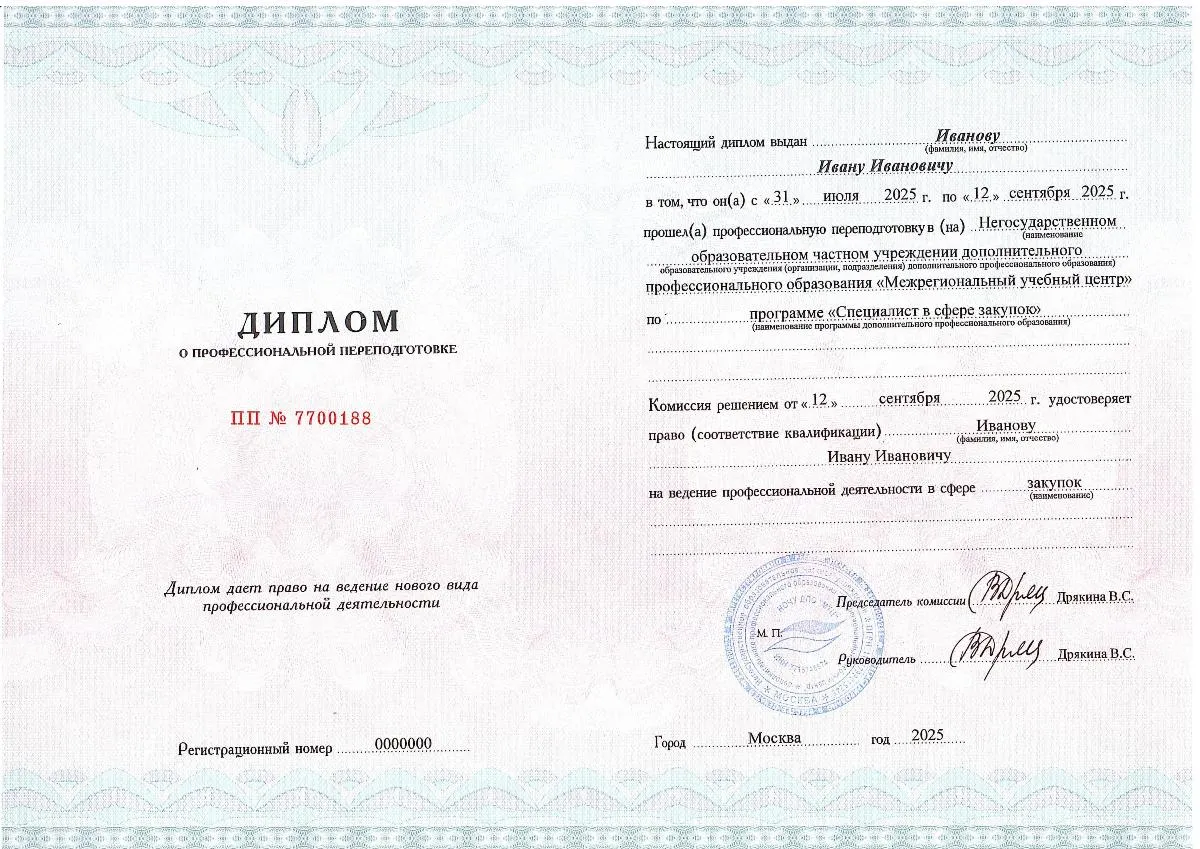 Программа учитывает реальные запросы рынка, соответствует профстандарту и завершается выдачей диплома о профессиональной переподготовке в сфере закупок, который дает право на ведение деятельности в данной области.