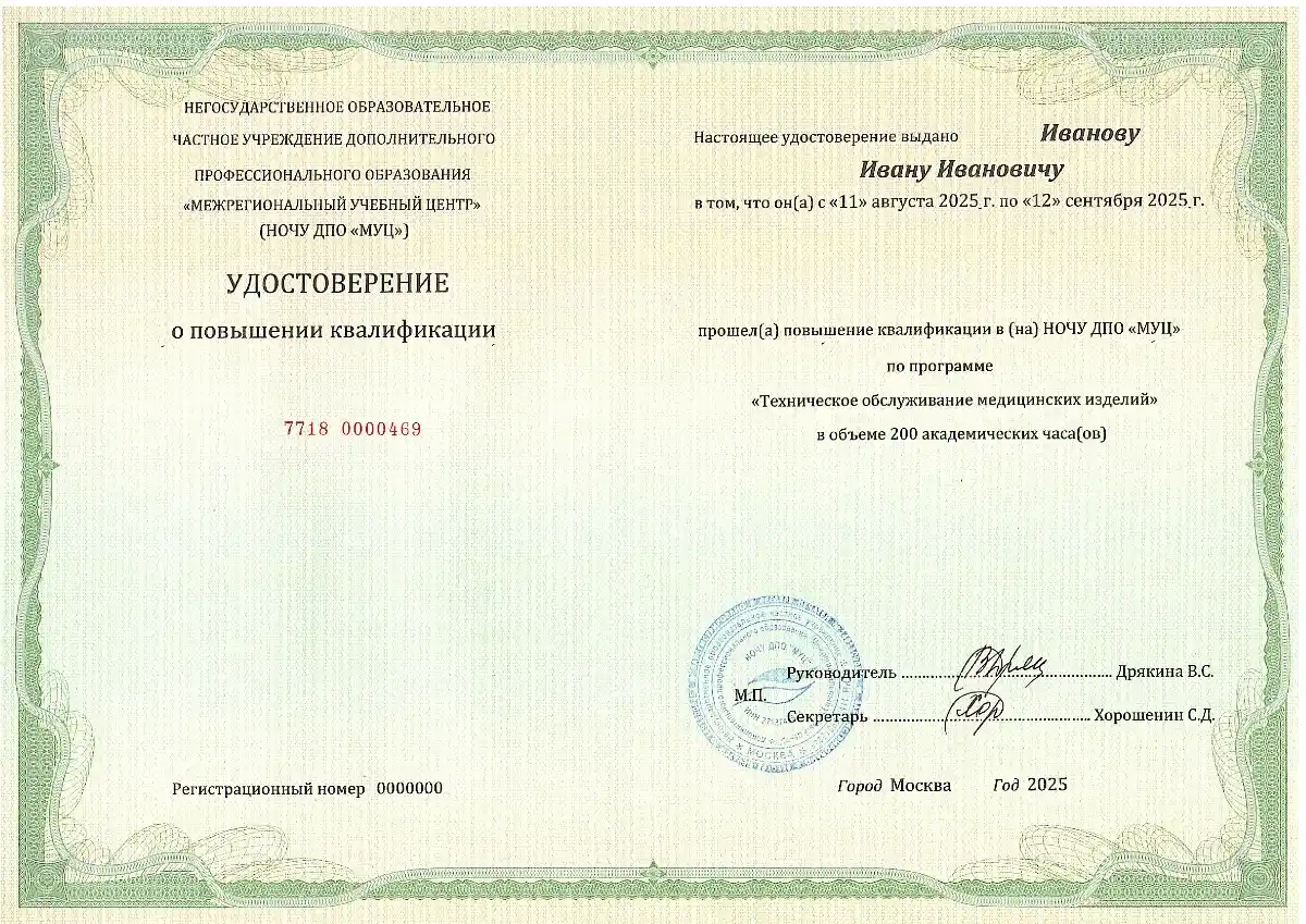 По итогам обучения техническому обслуживанию медицинских изделий слушатели проходят итоговую аттестацию. Успешно окончившие курс получают удостоверение о повышении квалификации установленного образца НОЧУ ДПО «МУЦ».