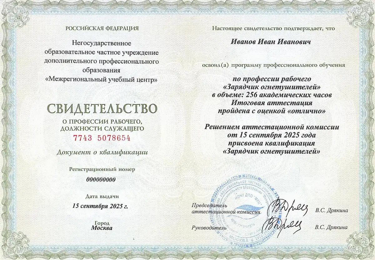 По завершении обучения проводится квалификационный экзамен, а выпускникам выдается свидетельство установленного образца о профессии «Зарядчик огнетушителей».